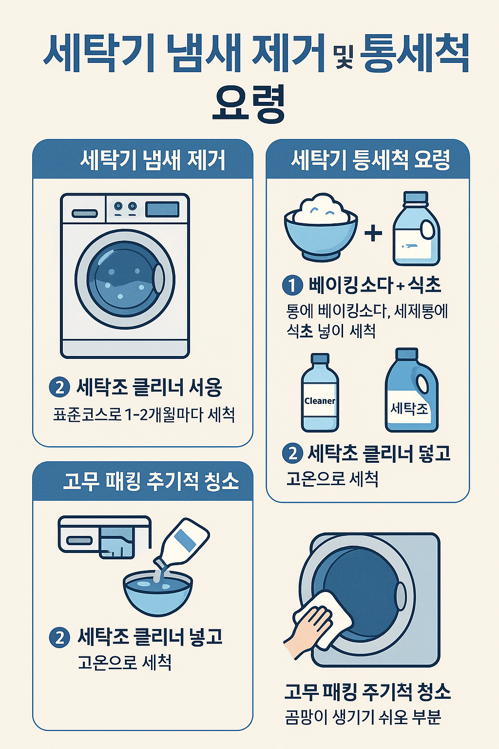 - 시중에서 판매되는 세탁기 전용 클리너를 사용해 1~2개월에 한 번 정기 세척
