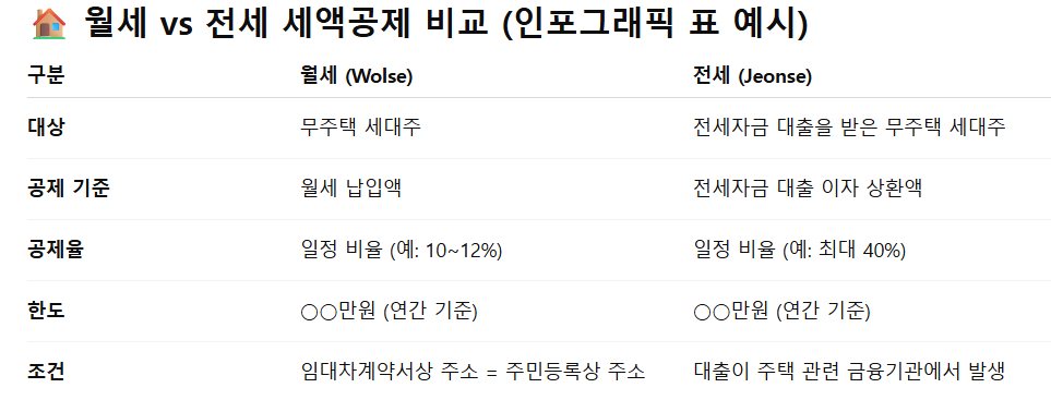 | 적용 제도 | 월세 세액공제 | 주택자금 공제 (대출이자 공제) |